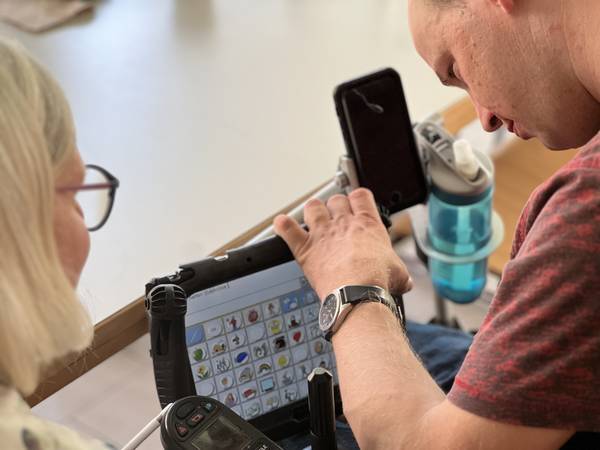 An diesem Tag will Manuel Bachofen als direkt Betroffener mit uns über Unterstützte Kommunikation reden. Um seine Stimme und damit seine Wünsche, Bedürfnisse, Ansichten hören zu können, müssen wir ihm Zeit für das Bedienen seines elektronischen Sprachassistenten geben. Er eröffnet das Gespräch per Tastendruck mit «Frage...» und signalisiert so sein Interesse zum Kontakt. Ich spitze die Ohren. «Wo wohnen?». Wir kennen uns und wissen von früher, dass ich in der Nähe seiner ehemaligen Heilpädagogischen Schule wohne. Wir freuen uns über das gemeinsam hergestellte Themenfeld.